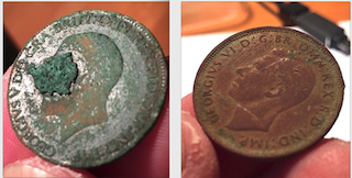 They could have been dropped by the same person, but we’ll never know… Still interesting to find two different ha’pennies on the same visit that are also two different kings, and both a ‘George.’