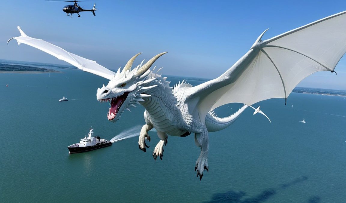 As the creature changed course, I realized it wasn’t a bird at all, but an enormous white dragon. It flew along the Solent, its wingbeats labored, suggesting fatigue.