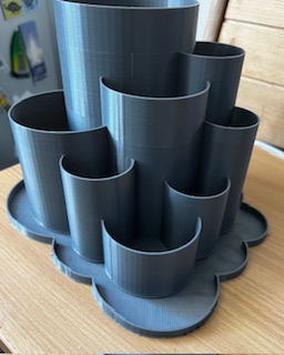 I’ve had some trouble with printing recently that turned out to be a Z-offset issue. So just to test the new settings I printed a few smaller things and then chose this multi-level planter as a larger project. You know, just to get confidence back in my printer. It took 12+ hours and that’s when I remembered I hadn’t put it in ‘vase’ mode or increased the infill to a point where I could trust it to hold water. I wasn’t going to print it again just for that so I went looking about for a drip tray that I could sit it on and not worry that my desk would get flooded overnight.