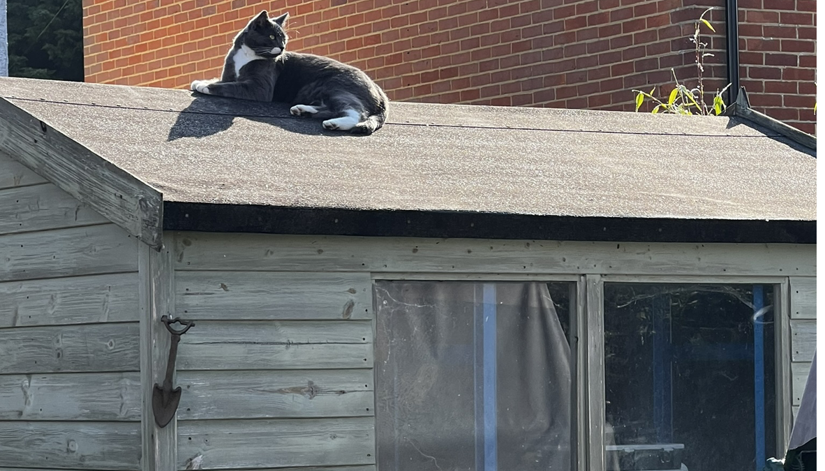 The neighbour’s cat Smokey is perched on my shed to enjoy the sunshine and observe visitors to our bird feeder. And I suspect to out run his housemate Houdini, who comes around 3 times a day to beg for kibbles.