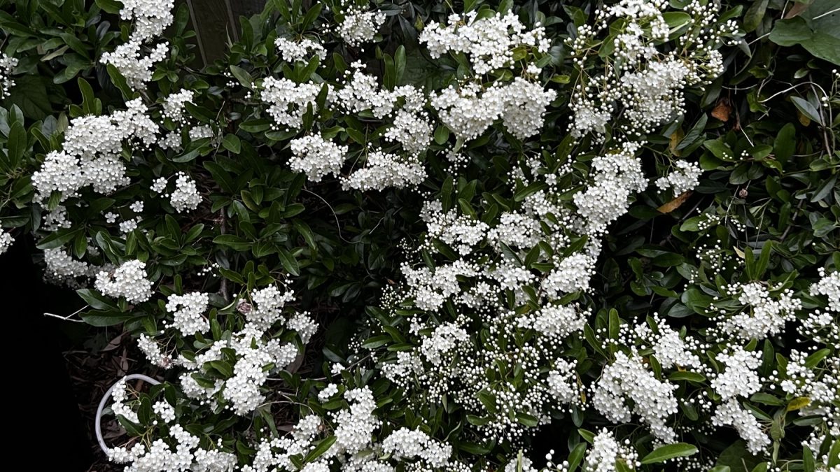 The pyracantha is laden with small white flowers. It reminds me of a Snowball Tree (Viburnum) when it looks like this. As amazing as this is, I can’t wait for all the red berries that will form where the flowers are now. The pyracantha gives a show twice a year.