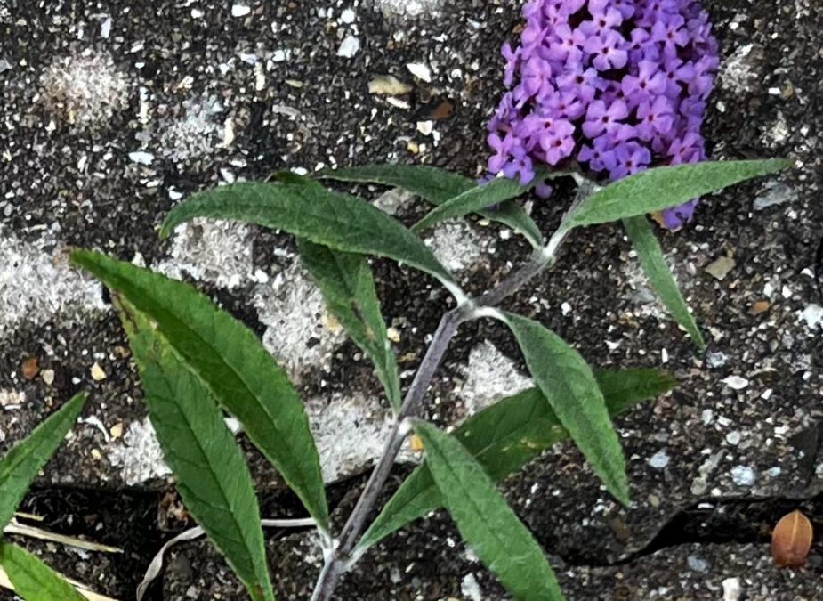 This budleia has grown horizontally in the pavement. It is barely 2 inches tall and 14 ‘long.’ Frequently trodden on and with scarce resources it still managed to flower. I am delighted and humbled by it.