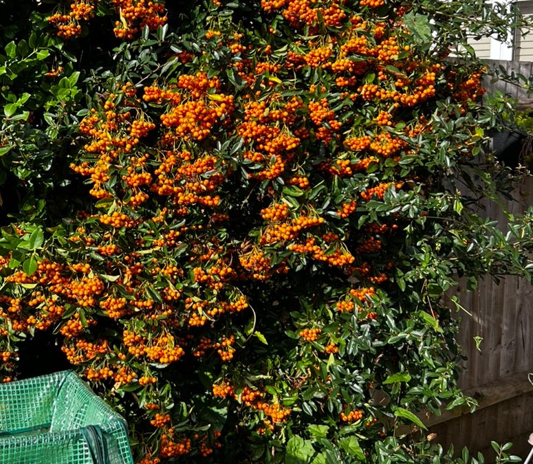 The pyrocantha has not bloomed again, but is an absolute cascade of red berries down our garden wall!