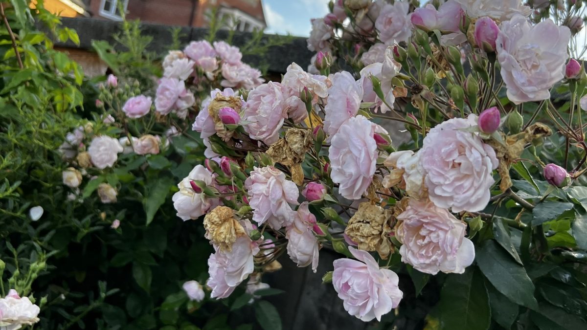 Here you can see roses in every stage of development . She has newly formed buds and everything in between to the last falling petals. That corner of our garden also houses a few spiderwebs that the petals get suspended in. It makes it a bit magical and I am certain the pixies dance nightly there.